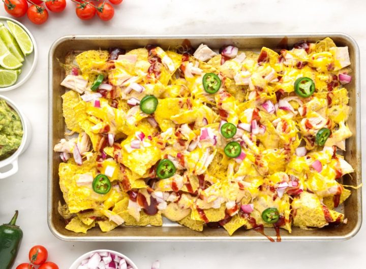 BBQ Chicken Nachos puikiai tinka dalintis su draugais vakarėlio metu arba kaip sotų pagrindinį patiekalą. Jie sukrauti...